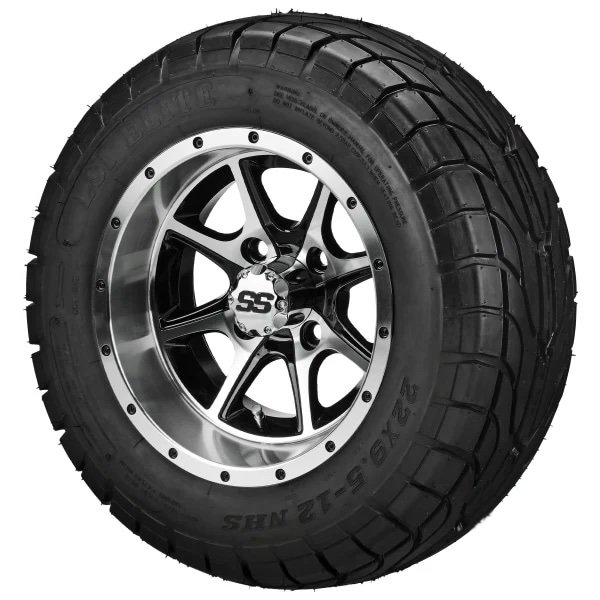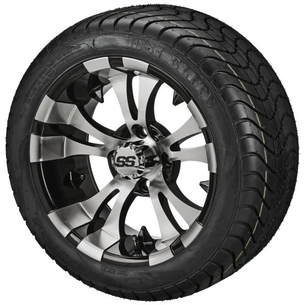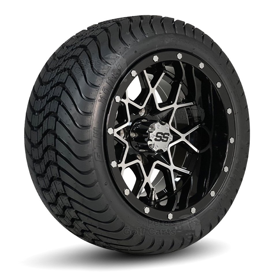 12″ Vampire Black/Machined Wheels and 215/40-12 DOT Low profile Golf Cart Tires – Set of 4 – NO LIFT REQUIRED