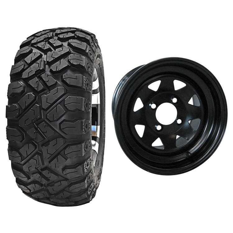 Upgrade your rig with this 23 inch tall golf cart tire and 12″ black steel combo for lifted golf carts! All tire options are 23″ for great ground clearance and superior performance when you need it most. Whether around the campground or farm, count on this set to accomplish the mission! Be sure to add your lift kit to accommodate this wheel and tire set!