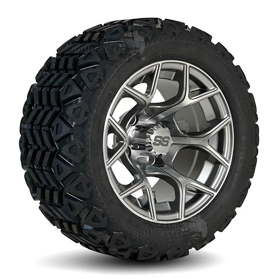 12″ Rally Gunmetal Golf Cart Wheels and 20×10-12 DOT All Terrain Golf Cart Tires – Set of 4 – NO LIFT REQUIRED