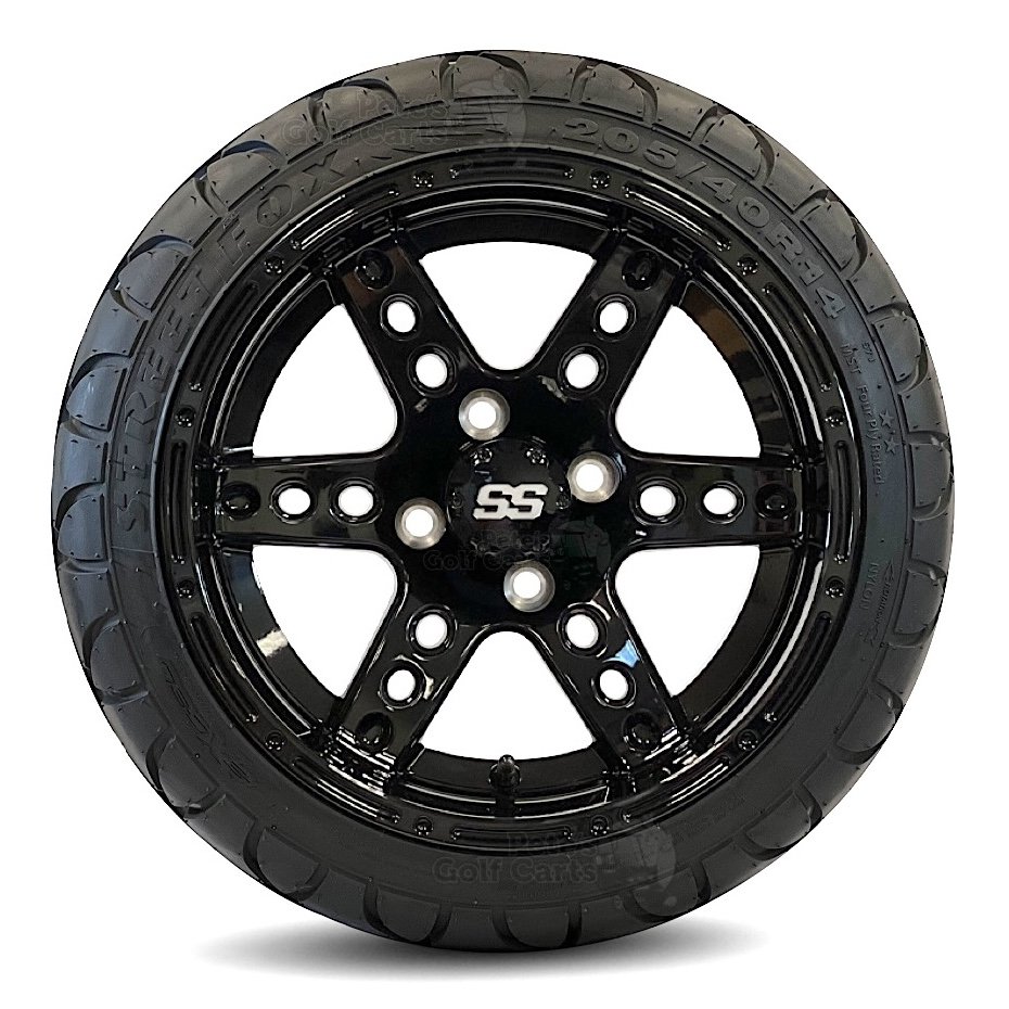 14″ Dominator Gloss Black Golf Cart Wheels and 205/40-R14 Excel Street Fox Radial Golf Cart Tires – Set of 4