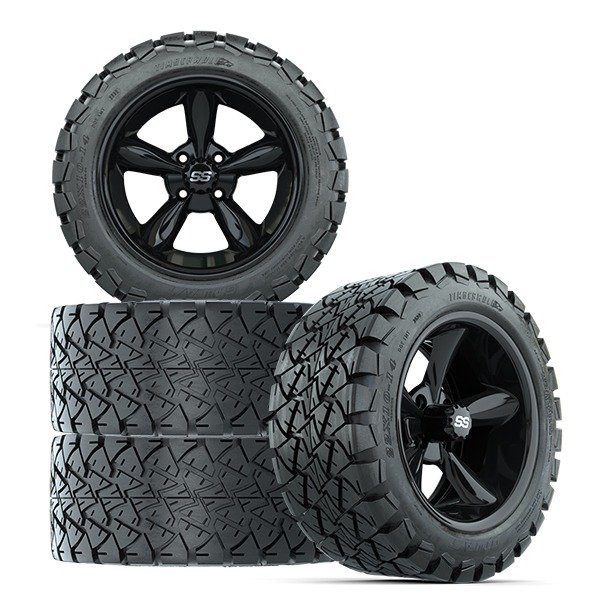 14″ Godfather Gloss Black Golf Cart Wheels and 22″ Tall GTW Timberwolf Tires Combo – Set of 4 – Includes Lug Nuts