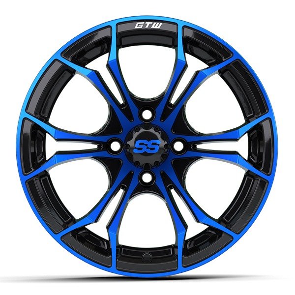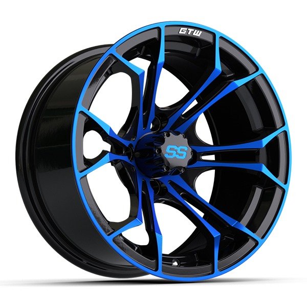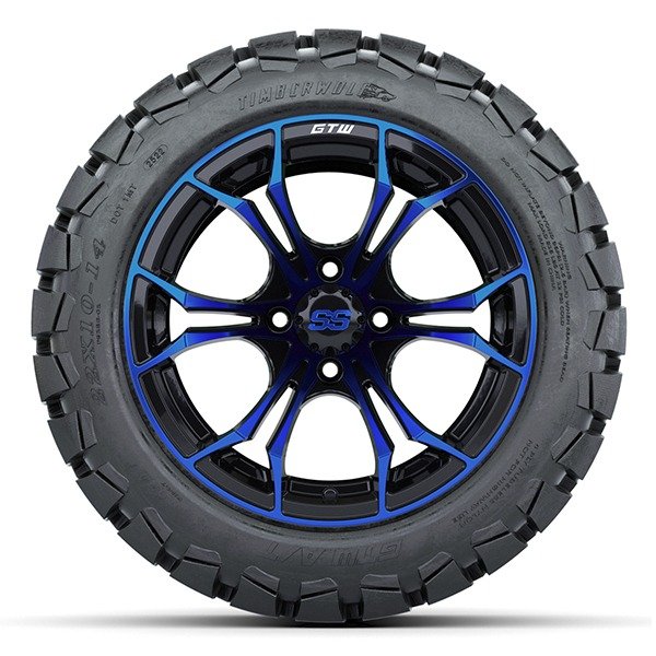 14″ Spyder Blue/Black Golf Cart Wheels and 22″ Tall GTW Timberwolf Tires Combo – Set of 4 – Includes Lug Nuts