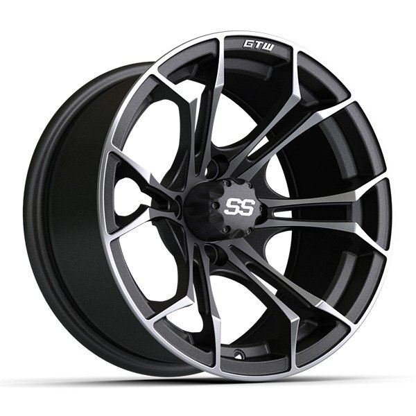 14″ Spyder Matte Gray and Machined Aluminum Golf Cart Wheels and 22″ Tall GTW Timberwolf Tires Combo – Set of 4 – Includes Lug Nuts
