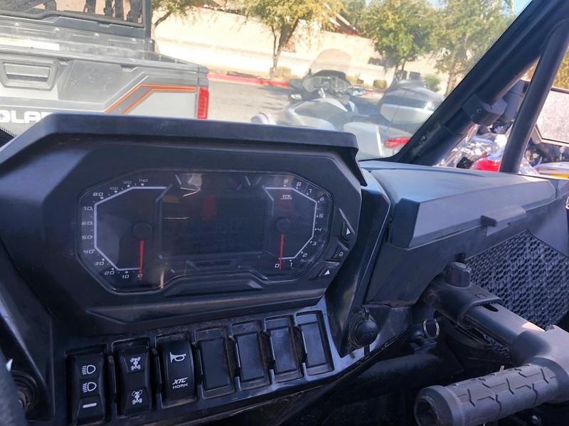 • Dual-sweep Analog Dials w/ 4″ LCD Rider Information Center: User Selectable Blue/Red Backlighting & Brightness, Programmable Service Intervals, Speedometer, Tachometer, Odometer, Tripmeter, Clock, Hour Meter, Gear Indicator, Fuel Gauge, Coolant Temperature, Voltmeter, Service Indicator and Codes, Seat Belt Reminder Light, Gear Indicator, DC Outlet