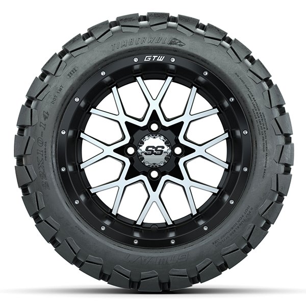 14″ Vortex Black/Machined Golf Cart Wheels and 22″ Tall GTW Timberwolf Tires Combo – Set of 4 – Includes Lug Nuts
