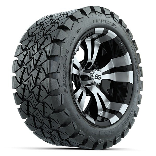 14″ Vampire Black/Machined Golf Cart Wheels and 22×10-14 GTW Timberwolf Tires – Set of 4