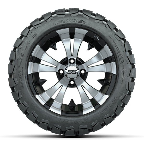 14″ Spyder Black/Machined Golf Cart Wheels and 22×10-14 GTW Timberwolf Tires – Set of 4