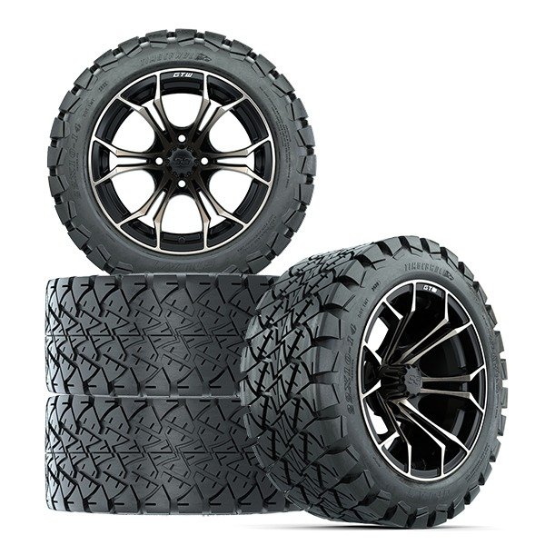 14″ Tempest Black/Machined Golf Cart Wheels and 22×10-14 GTW Timberwolf Tires – Set of 4
